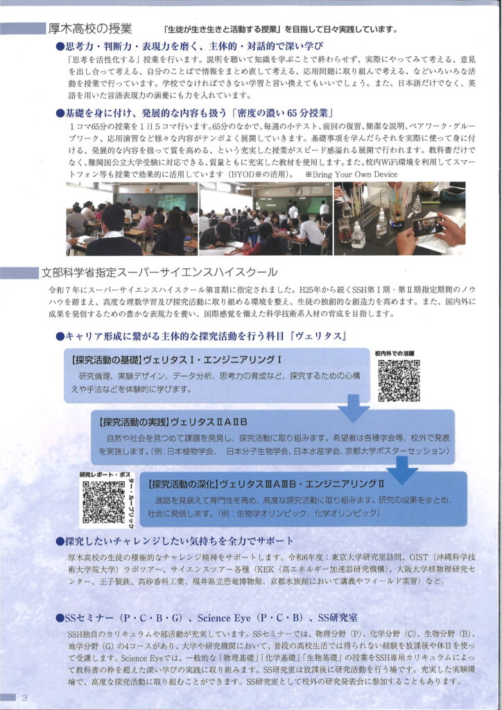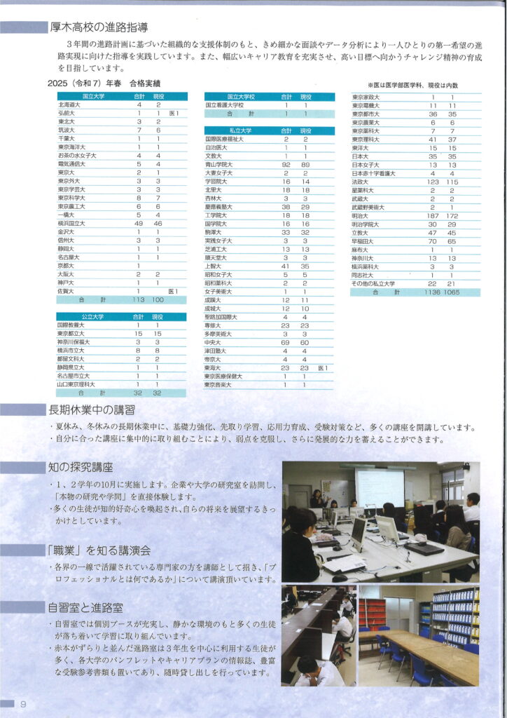 厚木高校は、県の「学力向上進学重点校」かつ文部科学省指定のスーパーサイエンスハイスクール(SSH)の指定を受けています。