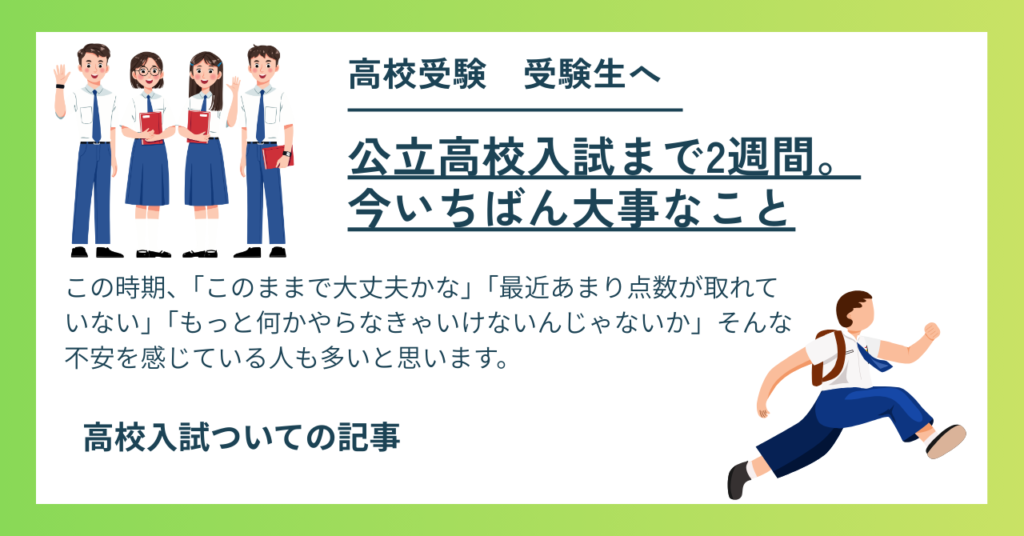 こんにちは。宮崎塾長です。 神奈川県の公立高校入試まで、いよいよ残り約2週間となりました。 この時期、 「このままで大丈夫かな」 「最近あまり点数が取れていない」 「もっと何かやらなきゃいけないんじゃないか」 そんな不安を感じている人も多いと思... -