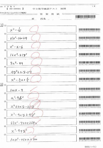 下は最近実施した中3生の「式の展開」の確認テストの解答用紙です。問題は、パソコン上で単元ごとにわたしが選んで作ります。たくさんのデータベースの中から選ぶので難易度も自由に設定できます。今の回は公式がしっかりと理解できているか、置き換えて展開が出来るようになっているか、のふたつを確かめるために問題を作成しました。